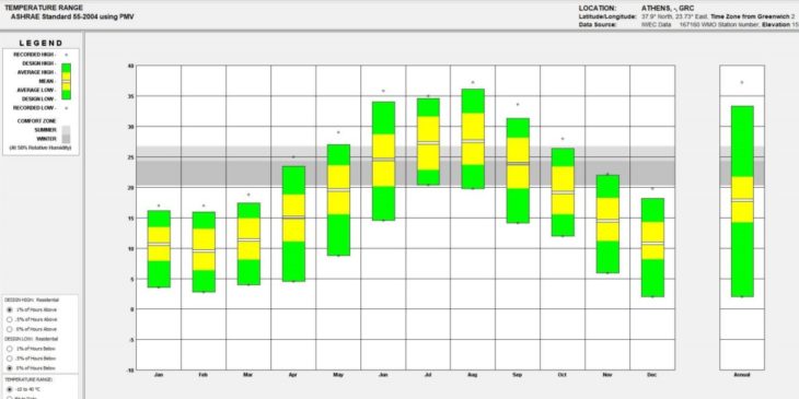 The selected city for locating the building, is Athens, in Greece, where the climate is Mediterranean, mild and generally warm and temperate. During summer the weather is sunny, hot and dry and winters are mild, wet and rainier than summers. The average annual temperature is 17.5 °C. Summers in Athens are usually very hot and in July and August temperatures usually reach 30 to 35°C, but sometimes even 40°C and more. There is a strong northern wind which usually sweeps through the east coast of Greece during July and August, and this offers a welcome relief to the heat, though sometimes can be very strong.