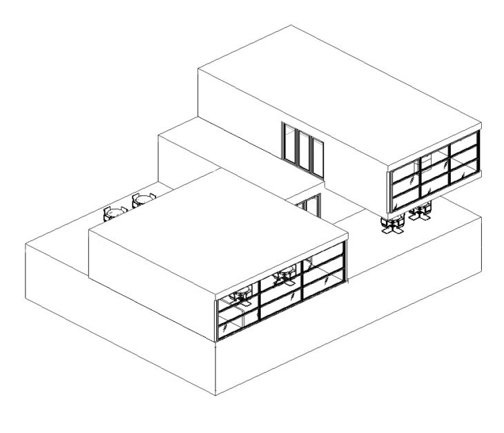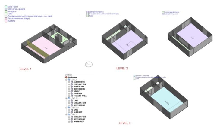 The building is an auditorium space, of 3 storeys with a multi-terraced area with green roofs & balconies, formed by different configuration arrangements. The auditorium is located in the ground floor, where also the reception area with the ticket office and other facilities can be found, while in the other floors cafeteria spaces and workshop areas can be found. The building is oriented in order the big curtain wall facades (in the cafeteria & workshop areas) face west, so to protect the building from the extreme north sun, as these are not spaces where direct sunlight is needed. According to the public function of the building, less intense sun from west is preferred through the curtain walls, while in the north façade smaller openings are being put to take advantage of the sun. The last floor is cantilevering creating an overhang for shading the outdoor cafeteria space that exist in the lower level. The outdoor areas are also protected from the intense summer sun, as they are oriented East & West.