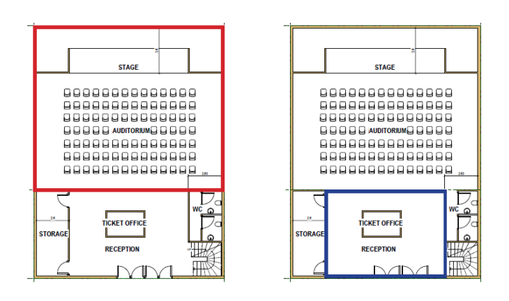 The installation of acoustic panels from Dampa (Clip-in Wall Solution, Clip in tile 600 x 600, or D-10, N T Panel), in both half of the ceiling and half of the walls for the main auditorium space & the reception hall, will improve the acoustic performance of the spaces. For better results it can be used Cork which has quite good NRC (NOISE REDUCTION COEFFICIENCY), 0.70, or Mineral wool, with NRC 0.95.
