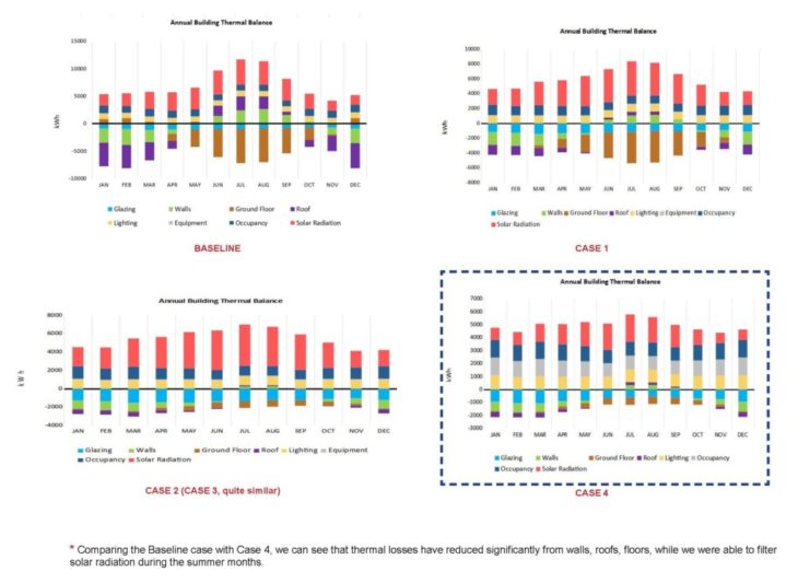 For all the cases for each simulation only one factor was changed in order to see the direct impact of each factor change. It is important to highlight that in all 4 cases passive optimization ideas were being applied in order to study the pure consequences of optimizing the building by changing the construction materials and the whole envelope. It is also crucial that from the beginning the building was oriented in order not to face extreme sun conditions / as it is a public building that that is not an extreme need for sun in functions like (auditorium or workshop areas). This decision left space for understanding the impact of the optimization factors in a scenario with moderate orientation.