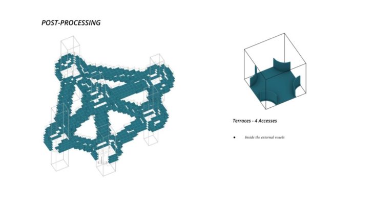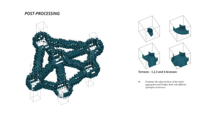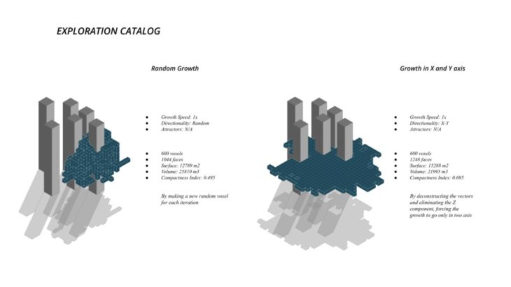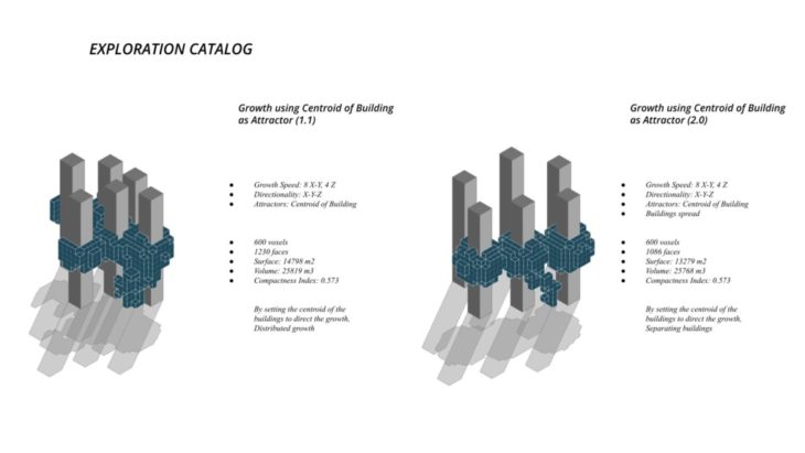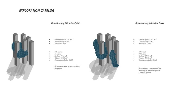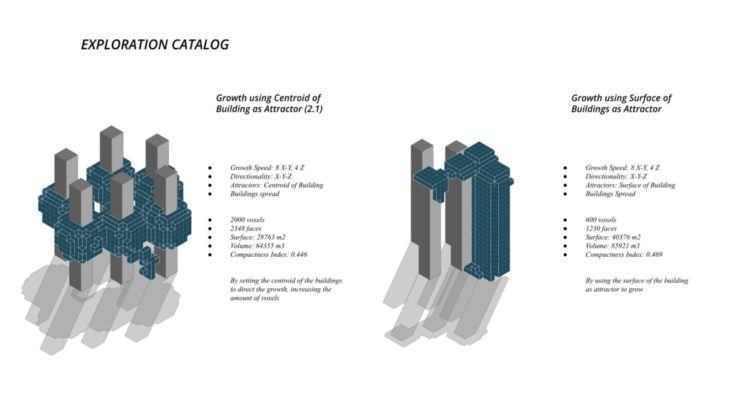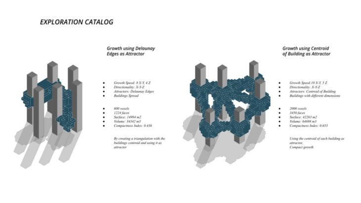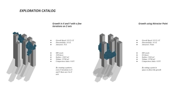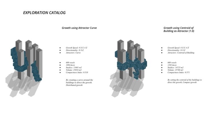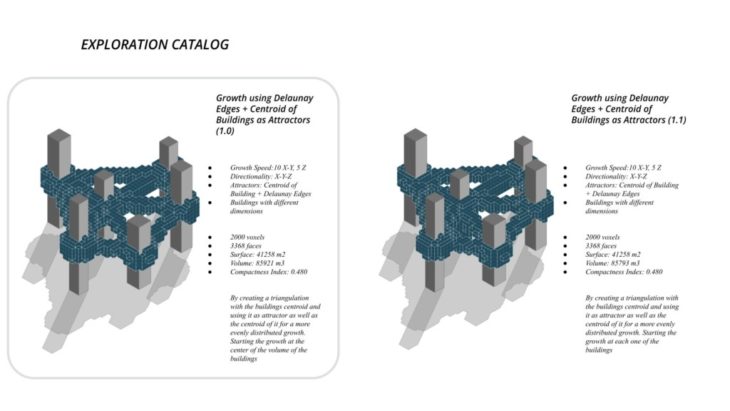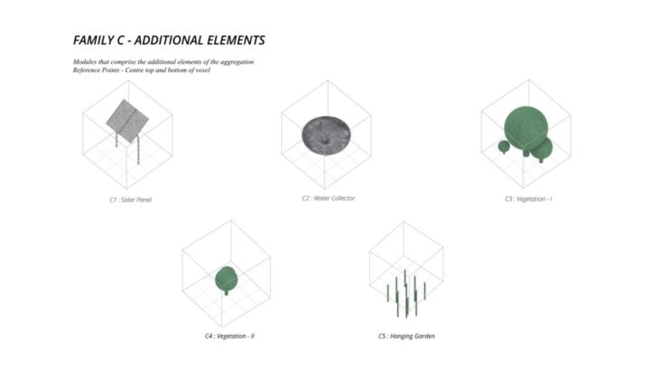 The project ‘PIXEL GARDENS’ incorporates iterative growth strategies between vertical structures and along their faces. Strategies include defining the growth along a predefined curve that goes around these vertical structures. The modules that are developed are divided into three families, with each family dealing with a specific type of element, namely, the voxel framework, internal spaces, external spaces and additional elements.
