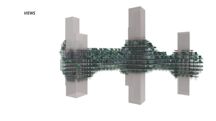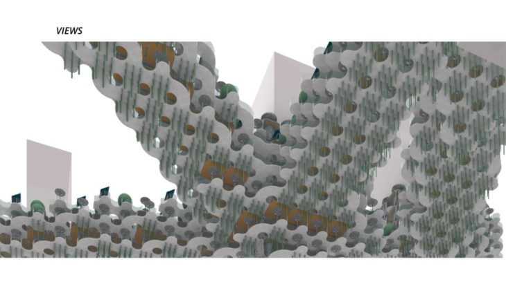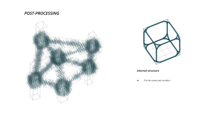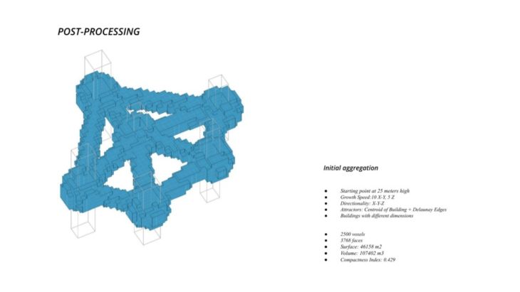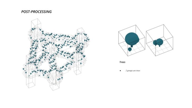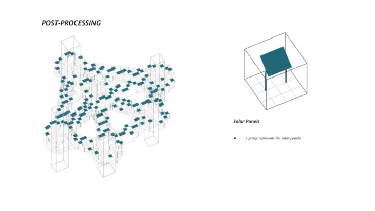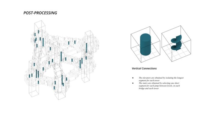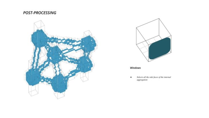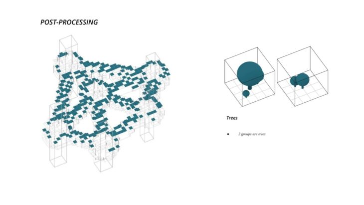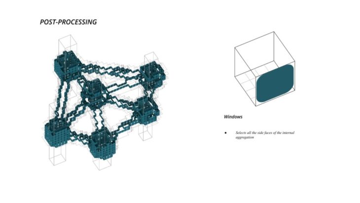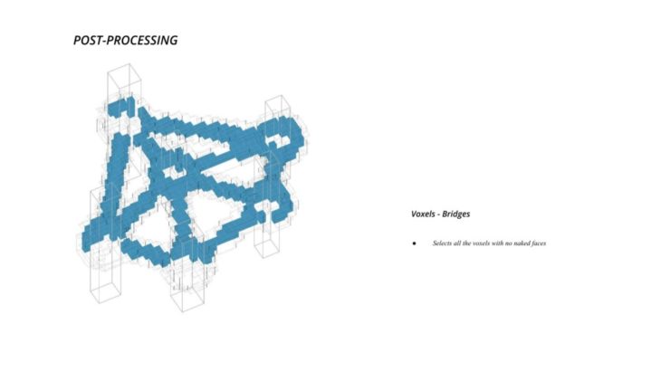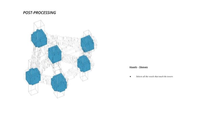 The project ‘PIXEL GARDENS’ incorporates iterative growth strategies between vertical structures and along their faces. Strategies include defining the growth along a predefined curve that goes around these vertical structures. The modules that are developed are divided into three families, with each family dealing with a specific type of element, namely, the voxel framework, internal spaces, external spaces and additional elements.