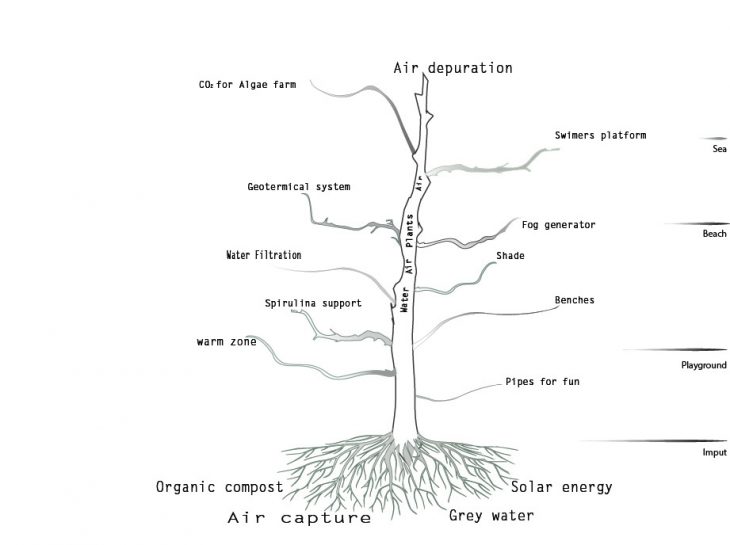 In Barcelona, just adjacent to the Bogatell Beach there is a long highway where the traffic is intense spreading major pollutants into the city, however, the proximity of the beach is a benefit to this situation since it can work as a source of water combined with solar energy. Such process starts from vacuuming the air from the highway through the bridge connecting to the beach with drilled pipes which will hold purification plants exemplified in the diagram, improving the quality for the air towards the beach. The pipes reach the beach forming a garden in the playground through a timber structure holding Aloe Vera in order to contribute for a continuous purification of the air. The following incorporates spirulina pipe system into the deep sea minimizing the carbon dioxide and improving the oxygen. Furthermore, the Spirulina Algae can also produce energy once combining solar energy and sea water allowing this improved air quality to evaporate into the city resulting into a continuous cycle of purification.