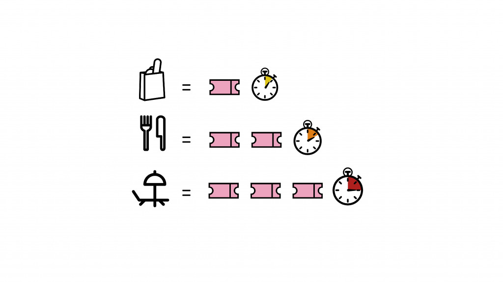 At the same time, different places in the city require different amounts of time to be paid. For example, grocery and pharmacies can be visited for 1 ticket (1 hour), coffee shops and restaurants require 2 tickets and those who want to go to a big public space like a beach or park have to pay 3 tickets.