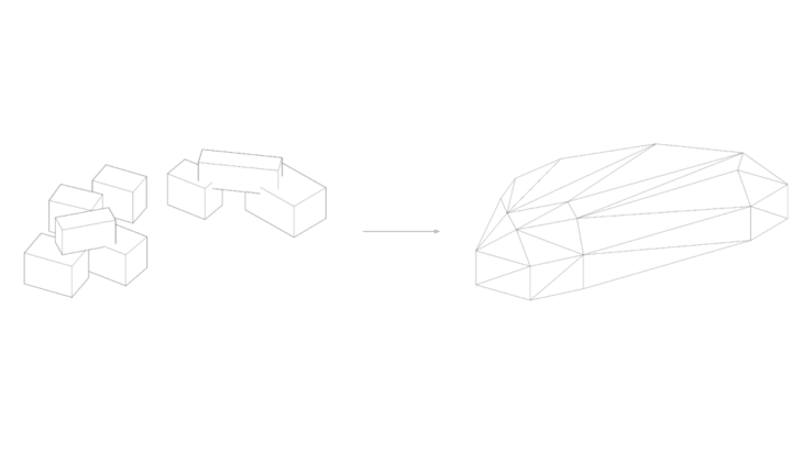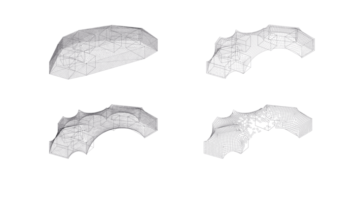 From the final selection of module layouts we then developed the simple polygon mesh shell into a panelized structure. First, the lowest faces of the mesh are excluded and the resulting mesh is triangulated. Next, the mesh is shrinked, with the edges of the blocks acting as anchors. The resulting canopy is then quad-remeshed in order to obtain panels of roughly 2,5mx2,5m. The faces of the mesh are dispatched with an attractor point. The result creates an opening in the canopy so that the sun reaches the central area/ park.