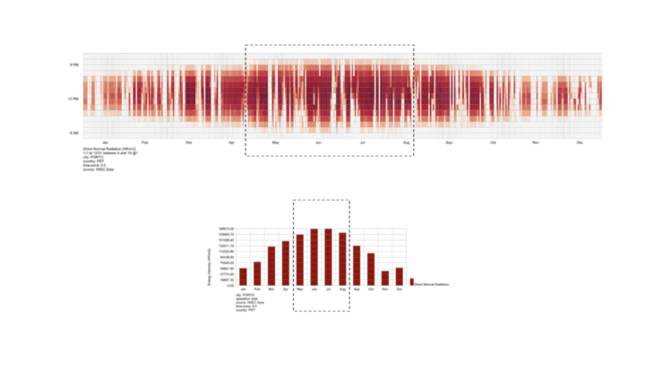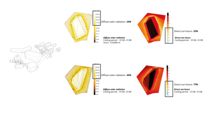 Our goal with the environmental analysis was to maximize the diffuse solar radiation to take advantage of the available natural light in Porto while minimizing direct sun hours on the structure for optimal energy efficiency. Additionally to take full advantage of the site we opted to maximize the total area of the building module layout to take full advantage of the large site and create a shaded open air park in the middle of the site similar to interior courtyards in traditional architecture. From the analysis we selected our preferred layout from the 7 most optimal results.