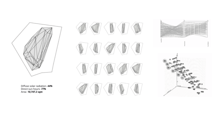 The Grasshopper plugin Octopus was used to generate our catalog of forms which were then fed into the Ladybug analysis. The final parameters analyzed were: percentage of shell below a specified number of sun hours per day, percentage of shell above a specified number of diffuse solar radiation per day, and total area of site utilized.