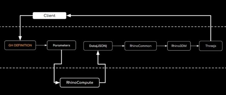 The driving parameters are defined in the grasshopper script as input components and resultant geometries as outputs. The values of parameters are called into a Rhino-Compute server, that solves the definition and returns data(in JSON) format. The solved data is decoded into Rhino geometry objects (in a 3dm document) using the common object decode in the rhino3dm.js (javascript) library Relevant userstrings are extracted and added to the geometries as attributes in javascript. Finally, using 3dm loader, the geometries are loaded into the three.js scene (and canvas) and are coloured using the attribute information from the geometry.