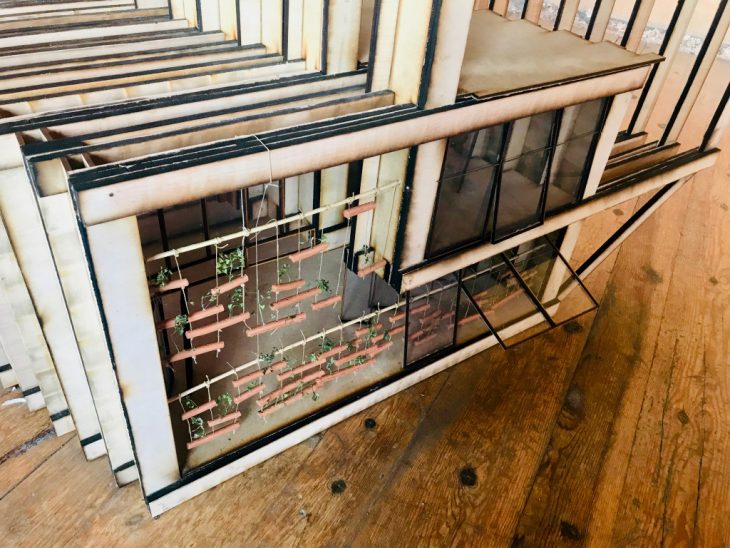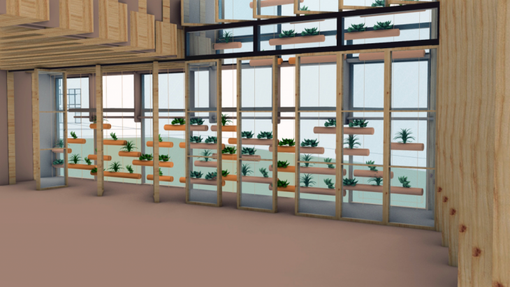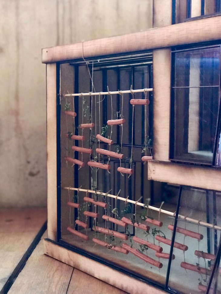 During summer, south-oriented windows are open for ventilation and solar energy generation. The second facade is adjusted in multiple ways to allow for ventilation and to maintain privacy for the activity happening inside. North-oriented windows are also open. During this season, the plants in the hydroponic system are fully grown, aiding in preventing sun infiltration.