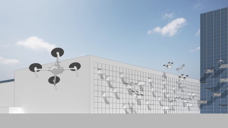 Three drone towers per hangar, with each hangar the capacity to store and charge 660 drones. Air Franca 3.0 drones pick up the packages from the building façade