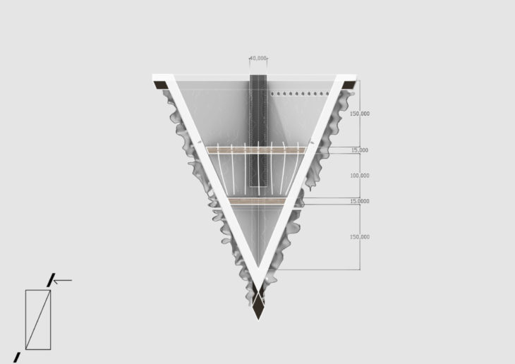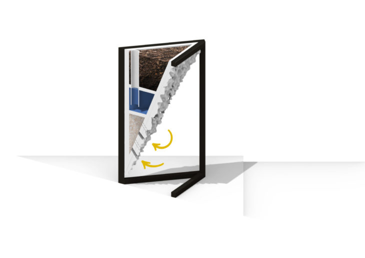 This is the section that shows how water access works. For growing plants we have two sections: one for the soil and second for water. They are connected with the pipe where you can poor water and fill the water tank. When plant needs it it can take water with the help of cotton strings from the tank.