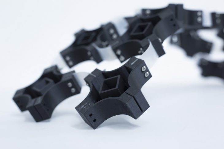 The system consists of multiple components placed in juxtaposition. Each component consists of four axes of rotation. Each axis is connected to the corresponding axis of the adjacent component by means of a joint. The joints thus connect two axes having degrees of rotation that are mutually supplementary i.e. the same degree of rotation that is a mirror of the other.