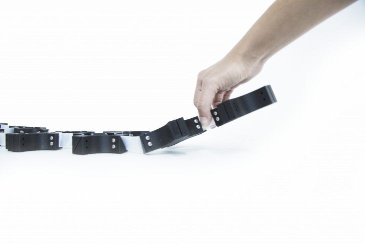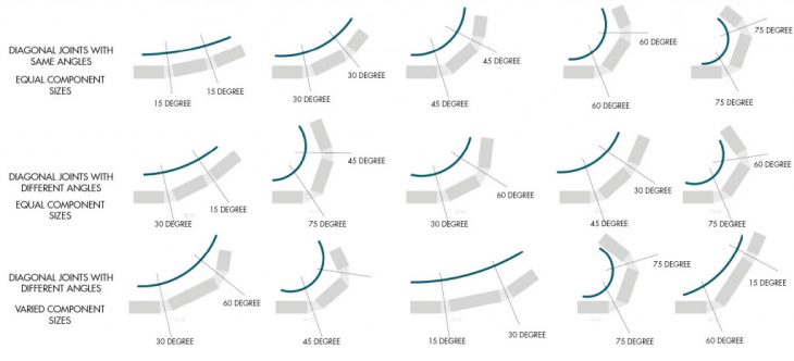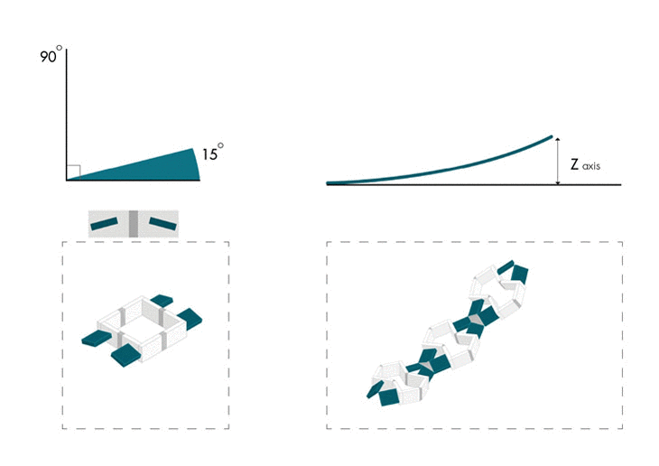 The components connected in a linear fashion, when actuated generates a series of curves of different degrees that depend solely on the rotational angle of the axes. The greater the angle of rotation, the steeper the curve.