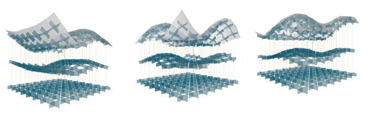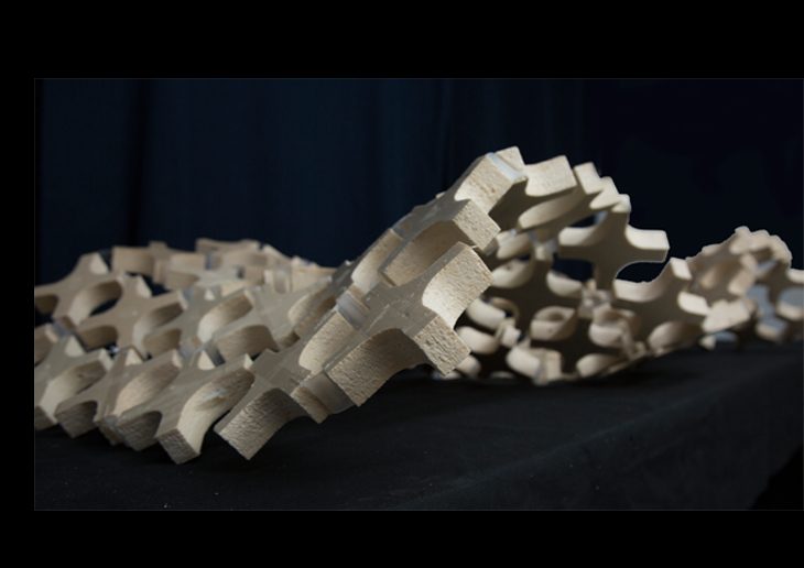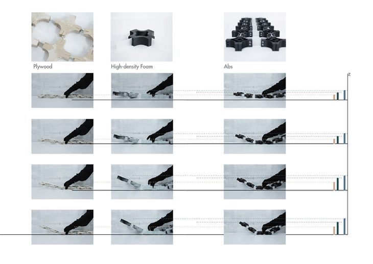 Comparison of the degree of curvature between linear grids of same components produced with 3 different Materials: The plywood components show clear limitation in movement propagation, whereas the 3d printed grid has the most stable form of connection.