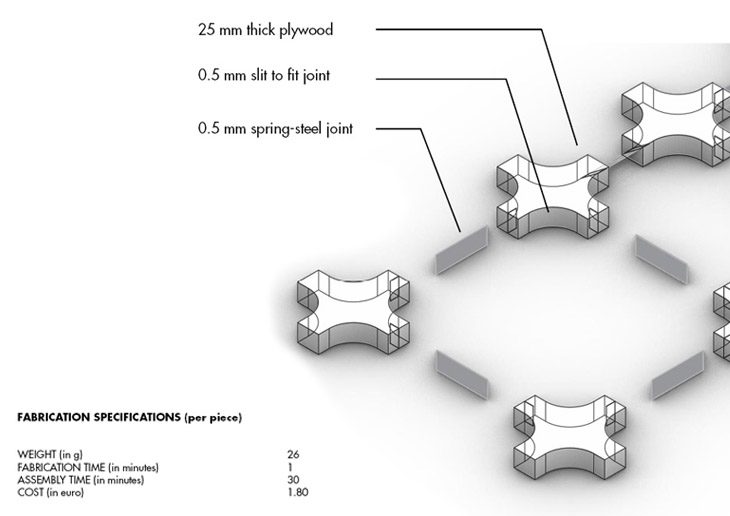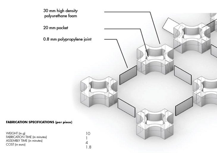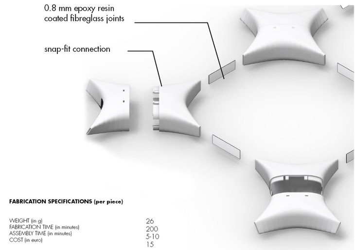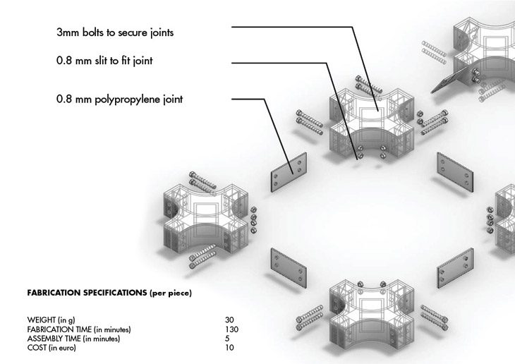 The component made out of foam is milled by a 3 axis CNC machine from high density polyurethane foam. In order to make the component lighter by weight so as to increase efficiency of propagation, each component is pocketed in the centre. The amount of pocketing depends on the structural duress incident on each individual component while still maintaining the integrity of its form. The joints for these foam components are of polypropylene that is laser cut to the appropriate size. The total length of the joint is 50 mm, 15mm of which on either side are wedged and glued inside the neighbouring components hence making the length of the joint between each component 30mm. Incisions of the correct rotational angle are made onto the components by means of a metal blade, guided by a 3D printed cap that fits onto the face of each component.