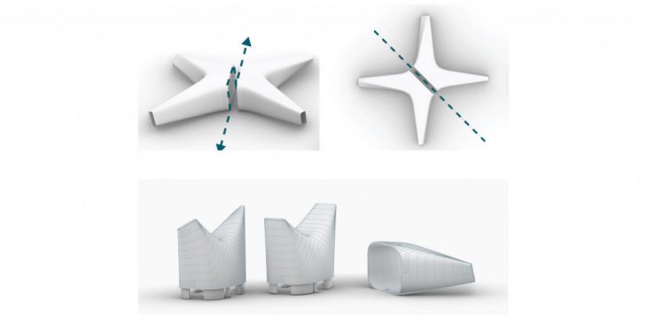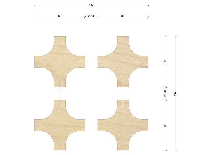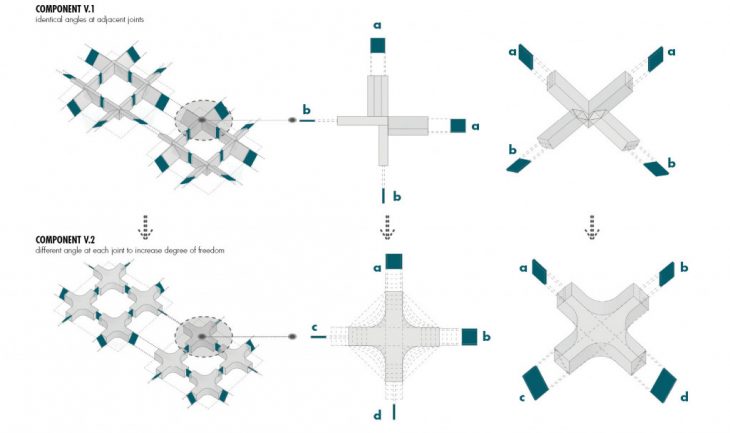 The form of the component is shaped around the axes of rotation. During the process of scaling up, in order to keep the points of intersection between the joints intact, the component assumes the shape of a cross that is rounded or chamfered where the two adjacent members cross paths. The material chosen for the component should essentially be lightweight yet structurally stiff. The material for the joints should be one that is flexible unidirectionally and can resist shear from the perpendicular direction. The distance between each component solely depends on the ability of the joint to distribute the actuation efficiently.