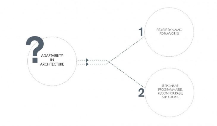 The subject of adaptability in architecture is tackled via two different approaches. The first approach is proposing a flexible dynamic formwork system with direct applications in the construction industry. The second approach is exploring the possibility of responsive, programmable structures which directly engage with the user and usage patterns resulting in a dialogue between form and user behaviour.