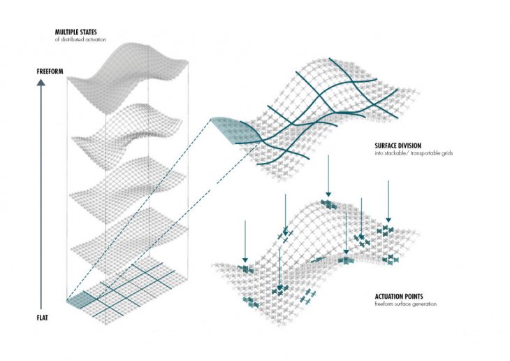 METAFORM can be used in various applications from temporary kinetic structures to shape changing formwork for lightweight fiber structures. The process of scalability is tackled by insuring the structural stability of the actuated surface which can only be achieved by the use of a rigid lightweight material at component scale. Modifying the density of a grid of components allows for the configuration of a large spectrum of freeform surfaces obtained from a flat grid, with a restrained number of manual and or mechanical actuation, locally distributed along the grid.
