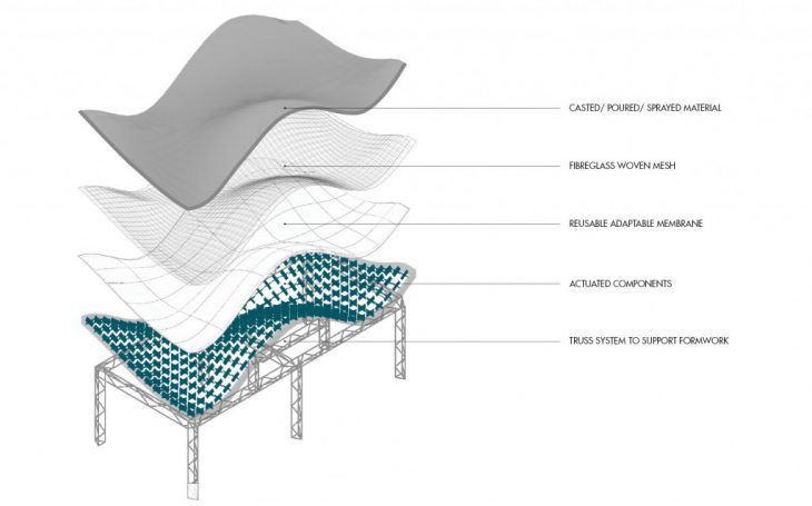 A hydraulic motorized system embedded on the components allows for the calibration of the formwork after local actuation in order to precisely match the desired target surface