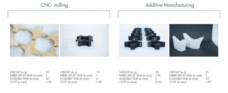 The development of the component involved both additive and subtractive manufacturing processes. While the additive manufacturing (3d printing in this case) proved to be more efficient in terms of precision and detail, the time taken to produce one component is 120 times longer than its equivalent in subtractive manufacturing (CNC milling in this case). The latter however requires post production processes such as sanding and the slitting of the component faces to attach the joints.