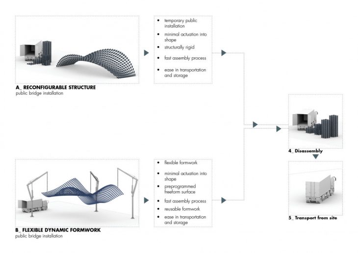 Looking into both scenarios of the system as a responsive reconfigurable structure and an adaptive formwork, the strategies for utilizitation of the system starting with off site production, packing and shipping, to on site assembly, actuation and placement are explained below.