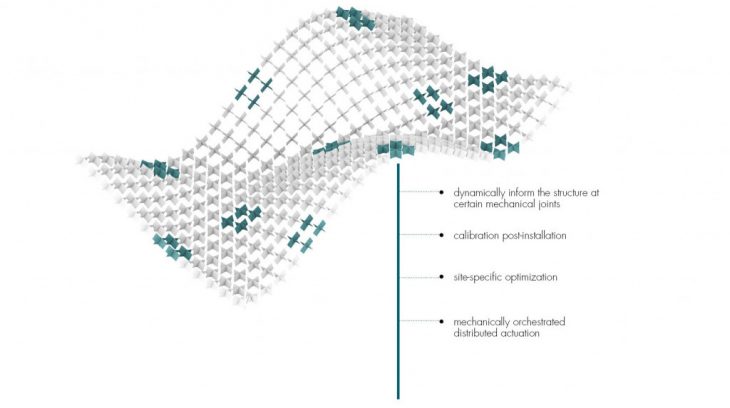The project explores the use of distributed actuation within a meta-material system, in an attempt to achieve an adaptive reconfigurable structure with multiple stable states. The use of materials which behave according to their structure as opposed to their inherent properties allows us to have control over the material system, the properties and behaviour of which can be controlled and manipulated by making minor alterations in the material’s design, resulting in an optimized mechanical behaviour of the meta-material.