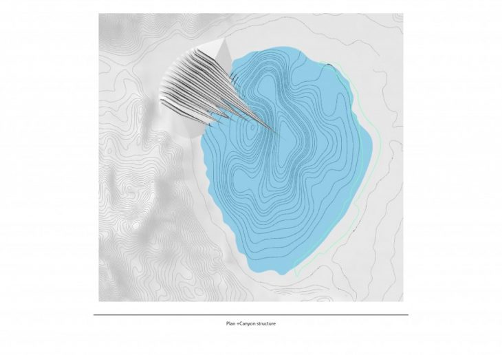 The thesis explores scenarios where the wind is taken as the dominant force of interaction between creating new artificial geographies, stimulating the regeneration of the lake’s ecosystem and encouraging new urban processes to take place. The drivers of the project take the form inspired by natural canyons as plug-ins devices to the existing geographical conditions. These new morphological additions to the surrounding landscape modify the natural environment for the purpose of using the wind as a supreme tool to steer processes of the lake’s rehabilitation. The main idea behind this structures is to recognize them less as representational imperatives and more as devices which work with performances: energies, forces and resistances. By switching conventional design processes to such mindsets, there open up numerous opportunities and possibilities that provoke the rethinking of new typologies, local economies, advanced agricultures and infrastructures, attentive to the definition of spaces in transitions and recovering landscapes.