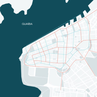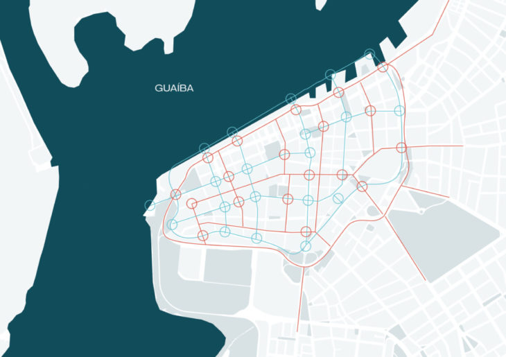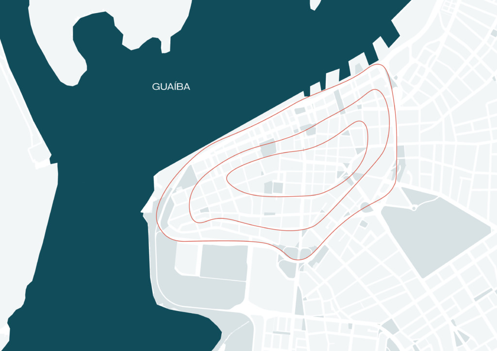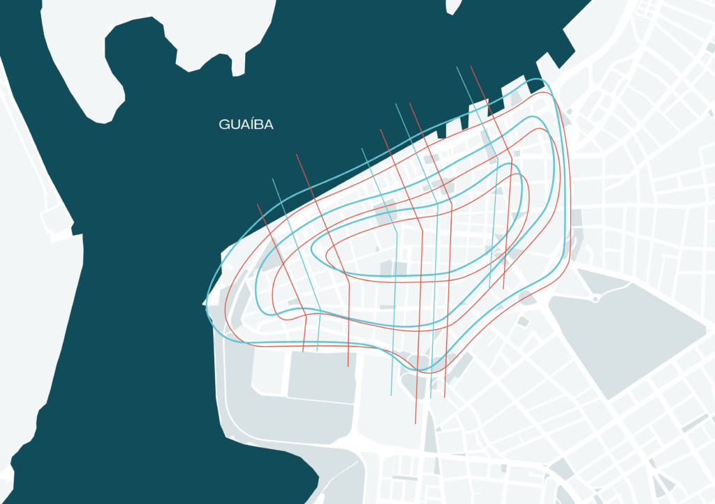 Definição das superquadras a partir da sobreposição de duas grelhas. A grelha de mobilidade (vermelha) baseia-se no sistema viário perimetral, do qual é realizado uma série de offsets em direção ao centro, criando novas faixas de centralidade. A grelha de ativação urbana (azul) toma forma no deslocamento da primeira em direção ao rio, de forma que esta seja inserida dentro das faixas definidas pela primeira grelha. Por último, ambas são interseccionadas por eixos Norte-Sul, com a intenção de conectar a interface da água com a cidade. Essa intersecção origina pontos de intersecção nos quais podem ser desenvolvidos projetos chaves para a estruturação do bairro.