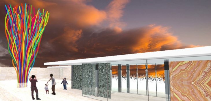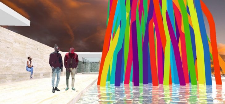 Inspired by open shapes and flexible spaces. The intervention exposes the construction from the inside out and exposing a skeleton of colored tubes from mechanical systems. The ducts on the outside of the building located in the water mirror begin to grow and take over the pavilion.