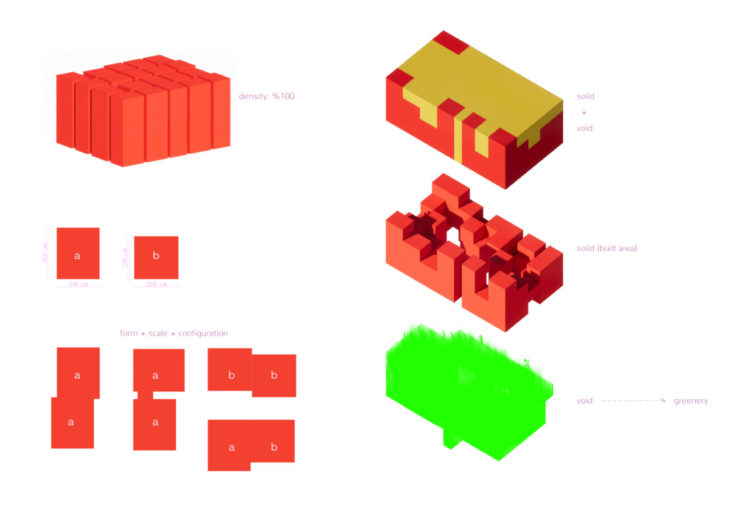 Therefore the plot was extruded to a reasonable height and divided into vertical units (such as a and b) The void that was taken out of the extruded solid, was turned into the greenery.