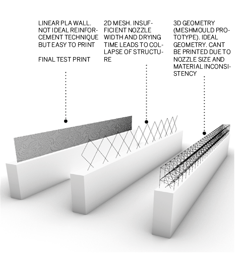One of the earlier researches into printing reinforcement published in 2014 by ETH Zurich dealt with printing a thermoplastic mesh reinforcement that serves as formwork and reinforcement for concrete.