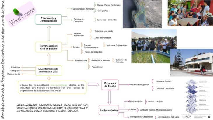 La propuesta metodológica plantea una sistematización de la información en función del análisis de las desigualdades Socioecológicas de los territorios degradados. Los datos obtenidos permiten identificar, jerarquizar y priorizar posibles áreas de intervención esquematizadas a través de la creación de mapas participativos que entreguen como resultados una serie de proyectos de remediación urbana a escala de barrios.