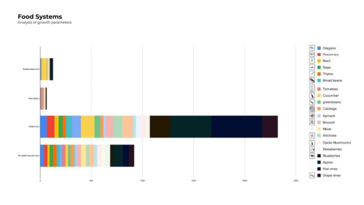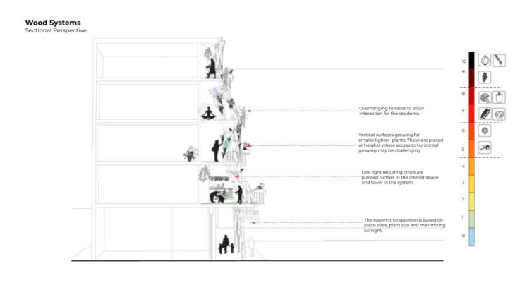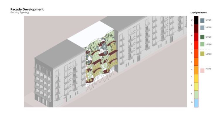 Looking at the food requirements of an average diet, there was a study made to find suitable crop types that can be grown on a façade supported by wood waste.