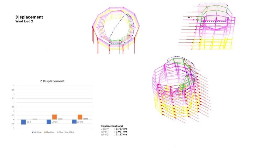 - Lateral displacement is almost nonexistent in most of the structure, the structure displaces facing downwards due to self-weight and gravity. The region with the largest displacement possibly is affected by its orientation, being directed inwards and held by cables might mean it’s pulling down using its self-weight.