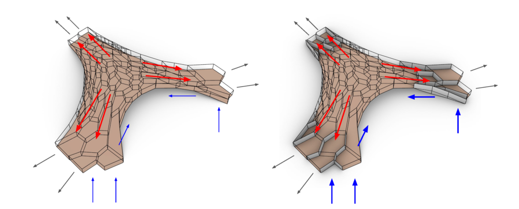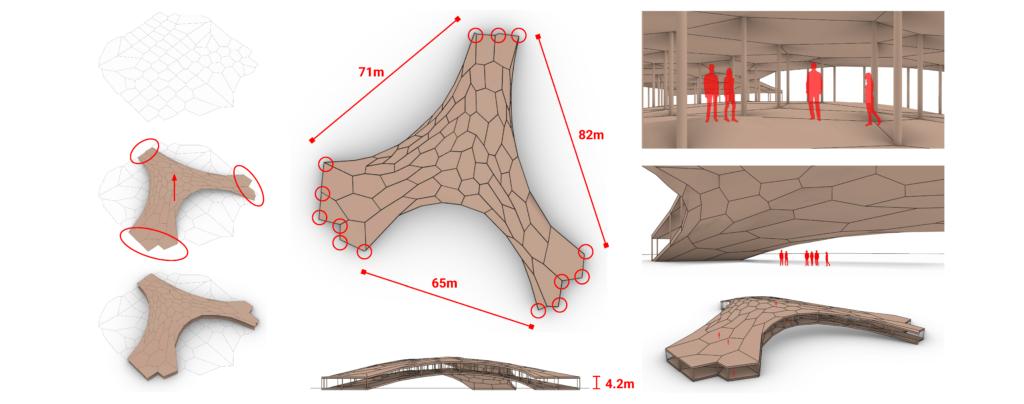 The bridge structure has a vault form and is generated from a 2D Voronoi pattern using a catenary form-finding method. The structure is only supported at the edges, where the vault meets the ground, which allows for the largest possible span of around 82m.