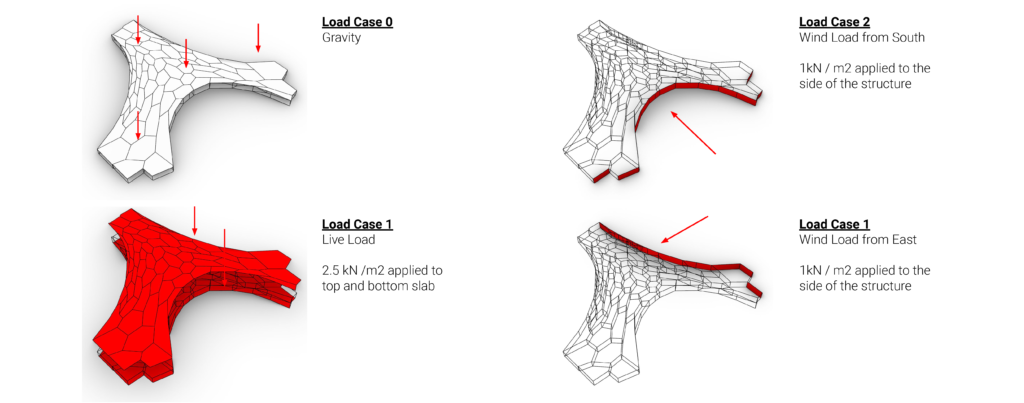 For this structural study, four load cases are applied to the structure: gravity, wind loads, and live loads. wind loads from east and south with 1 kN/m2 values are taken into consideration in the analysis. 2.5 kN Live loads are given to the top and bottom surface as the structure is expected to be trafficable internally and externally.