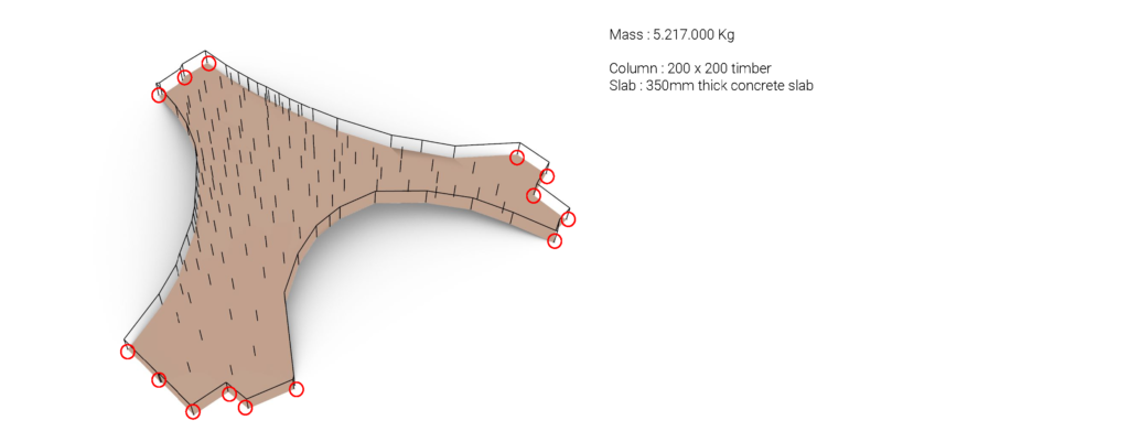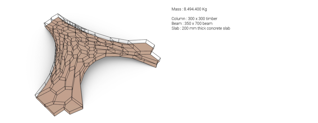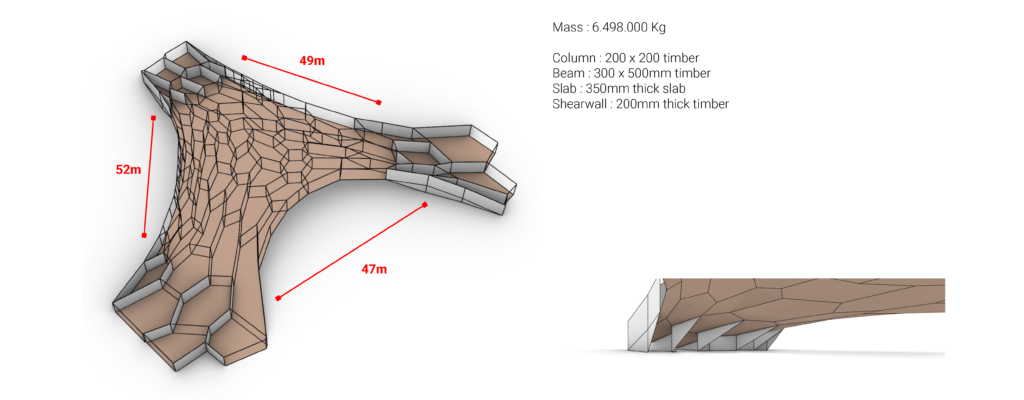 In this first option, the structure only consists of columns and shells ( top and bottom floor ). The column uses 200 x 200 timber and the slab uses 350mm thick concrete. The structure’s weight is about around 5.217.000 Kg