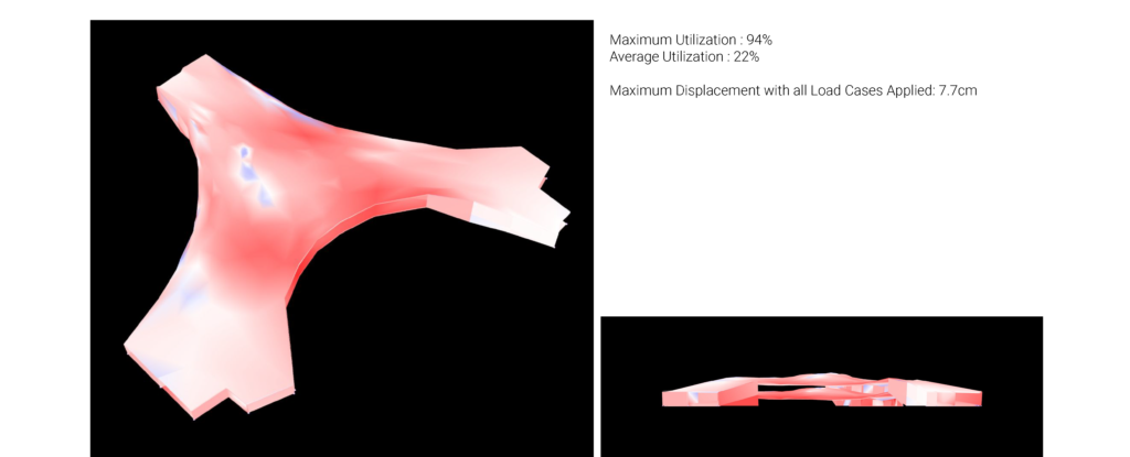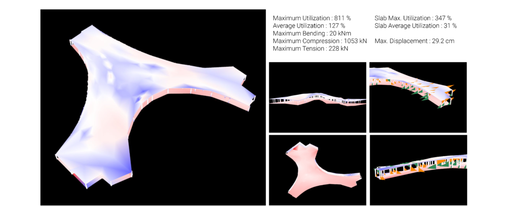 The 350mm thick slab is also working quite well considering its span. There is still potential improvement to reduce the thickness and the self-weight.