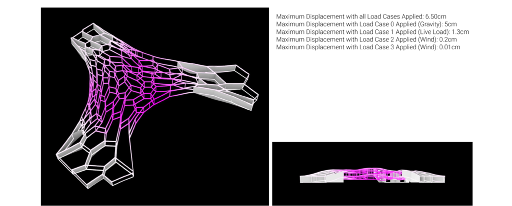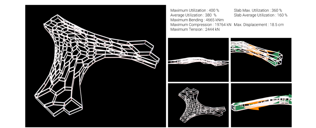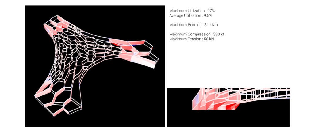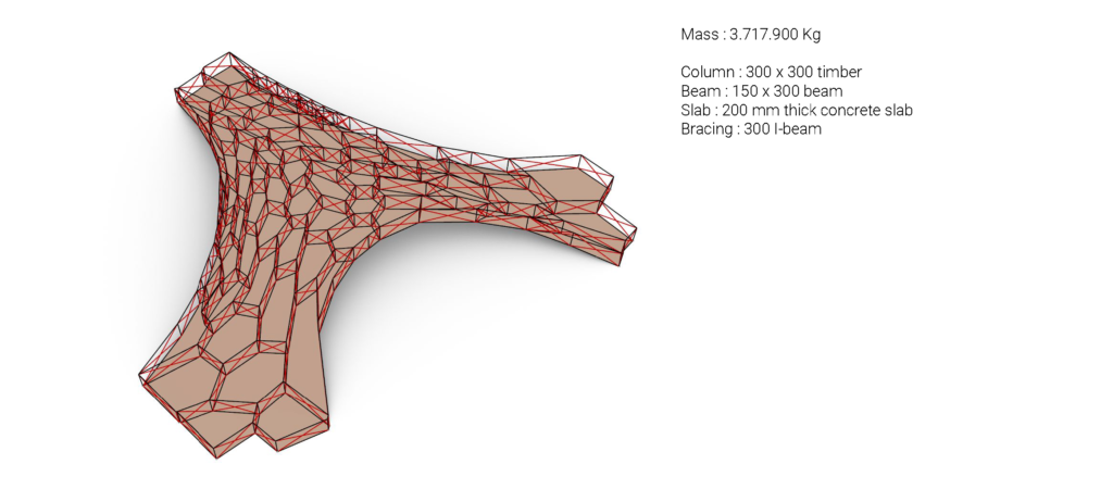 In this 2nd iteration, beams are introduced at every edge of organic patterns generated earlier. The idea is to make the entire structure work as a habitable space frame. The structure weighs about 8.494.400 Kg, much heavier than the previous option due to the addition of structural beams.