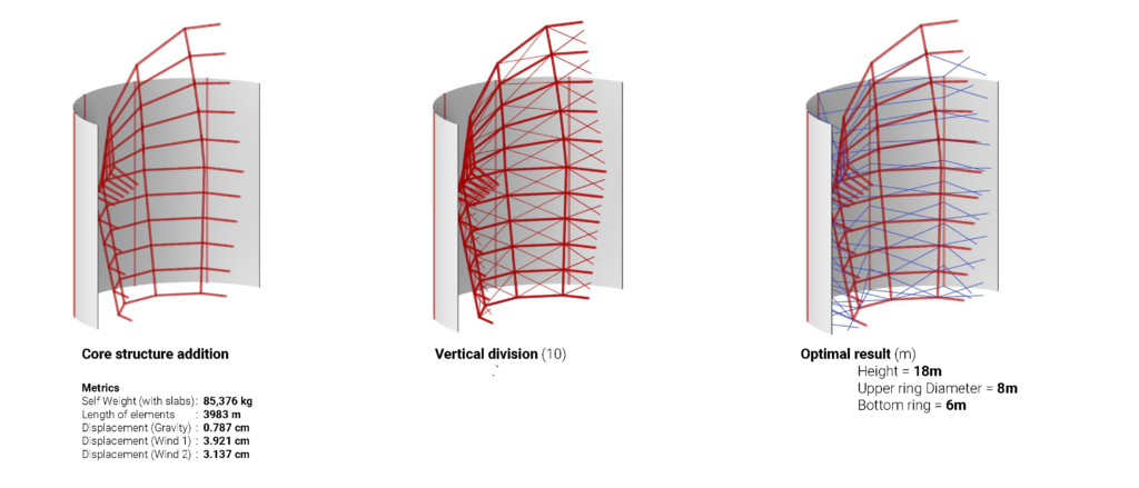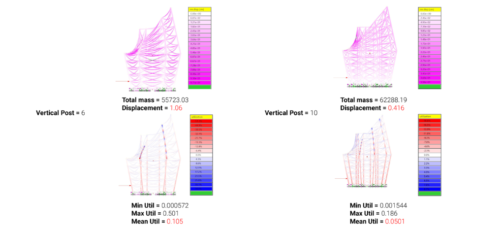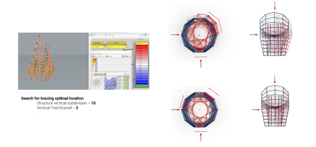 The placement of the bracing is done through genetic optimization. A Vertical post bracing of 3 and is subdivided into 10 divisions.