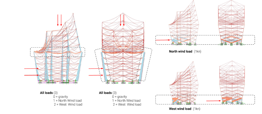The force is traveling as expected in the columns with the columns on the receiving end of the wind load are in tension while the columns opposite to it are in compression which makes sense if we consider that the columns are inclined inwards and not straight and the need for tension and compression to balance each other for stability. Interestingly the outer columns have almost no forces in them, transferring the loads to the inclined central columns.