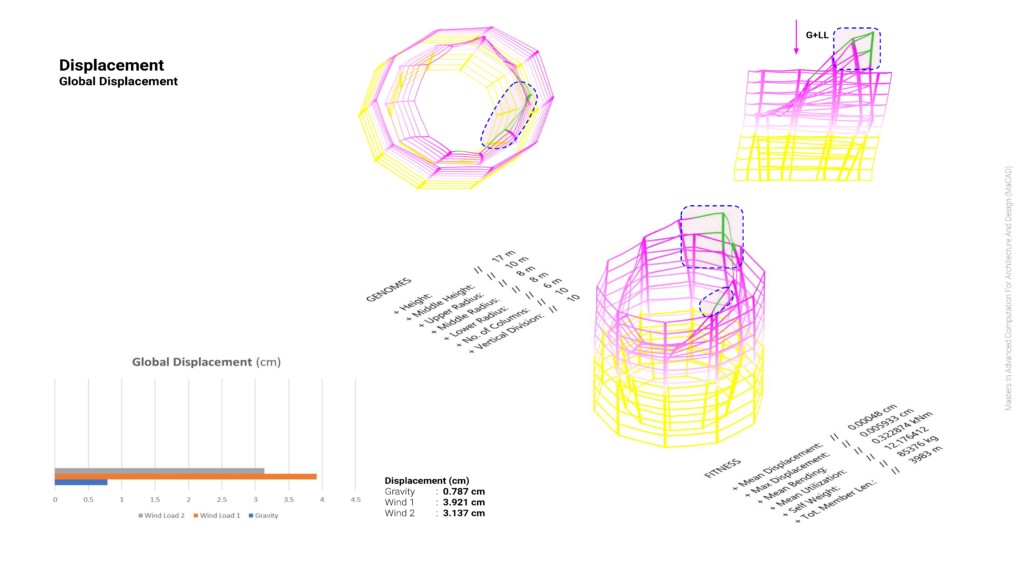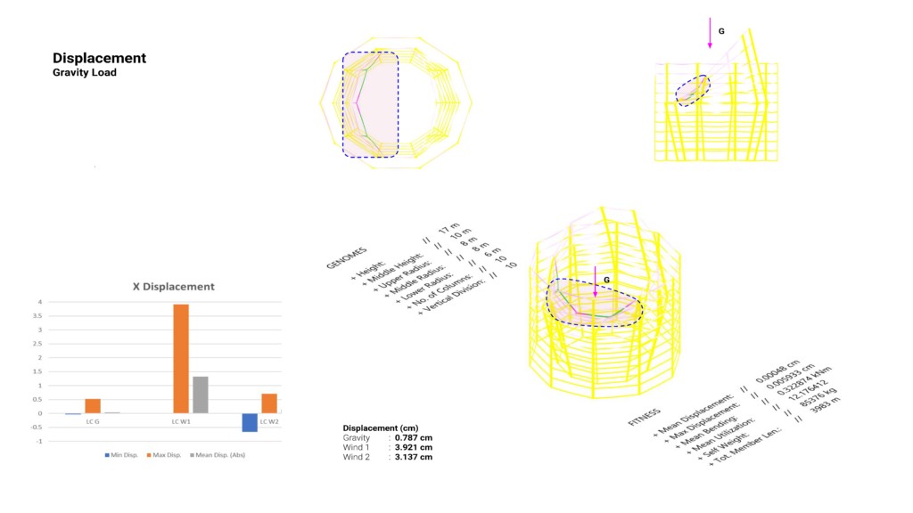 - The displacement is highest in the region where the tower extends to capture the air. The core is not connected to it and so it has no lateral support. The structure is displaced downwards due to gravity and self-weight.