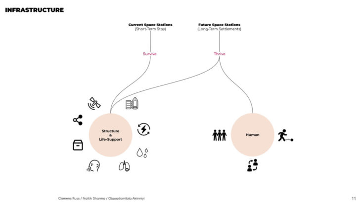 studio brief. the studio aims to create a space station that will be able to grow from 6 to 148 inhabitants. our team focused on the lower earth orbit space station infrastructure part of the overall space station. the infrastructure groups scope was to come up with a masterplan strategy for the whole station to grow and provide required basic lifesupport + energy services to the other groups (living, greenhouse, recreation, work).