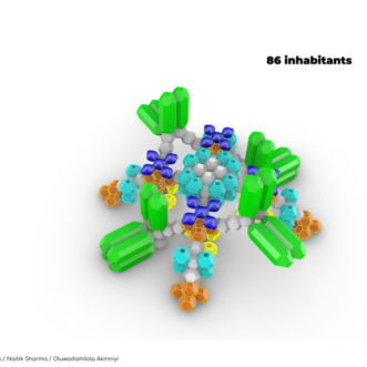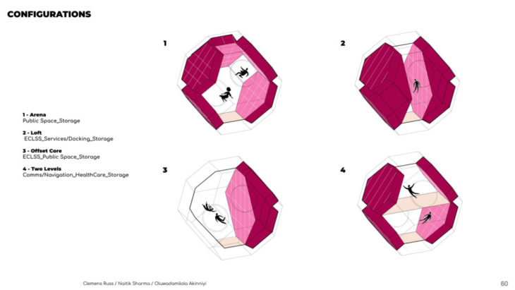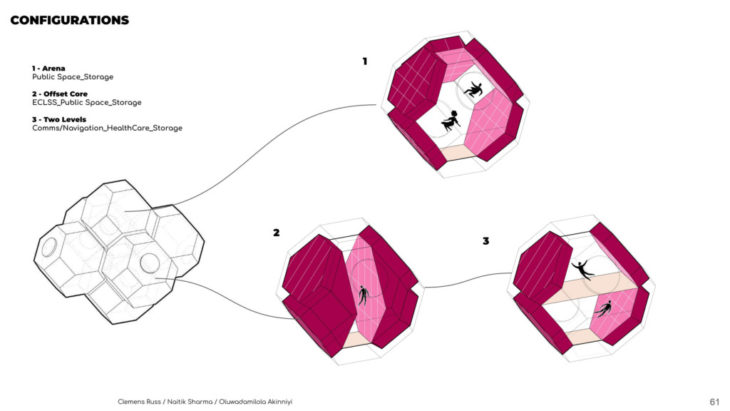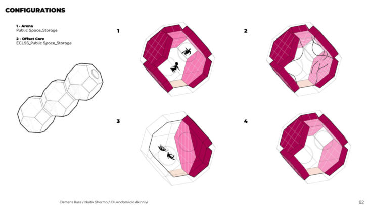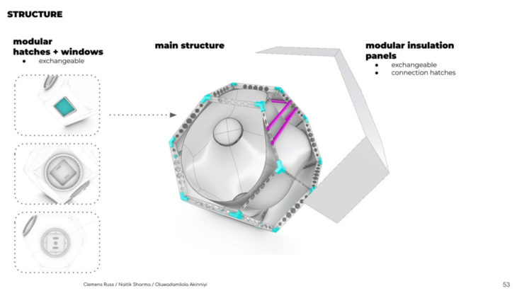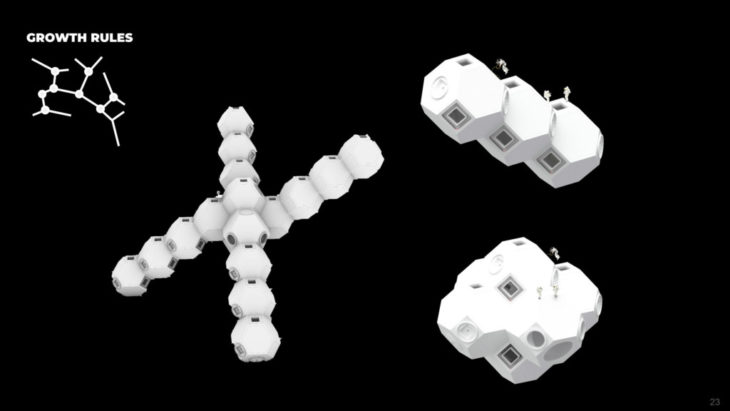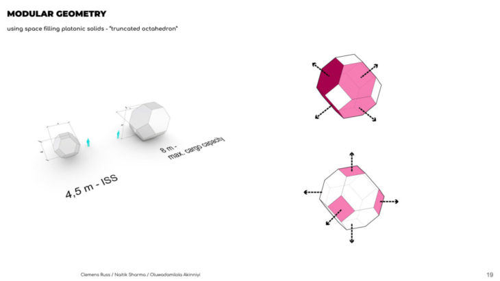 using space filling polyhedra / platonic solids “truncated octahedron”, the spacestation is enabled to grow in all directions through the hexagonal + rectangular faces.