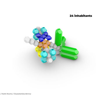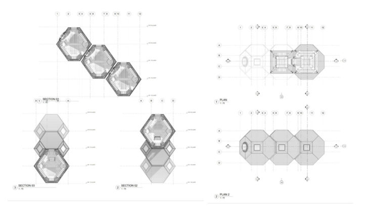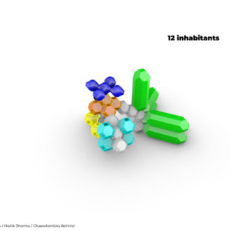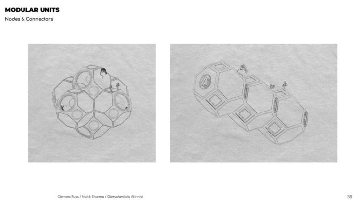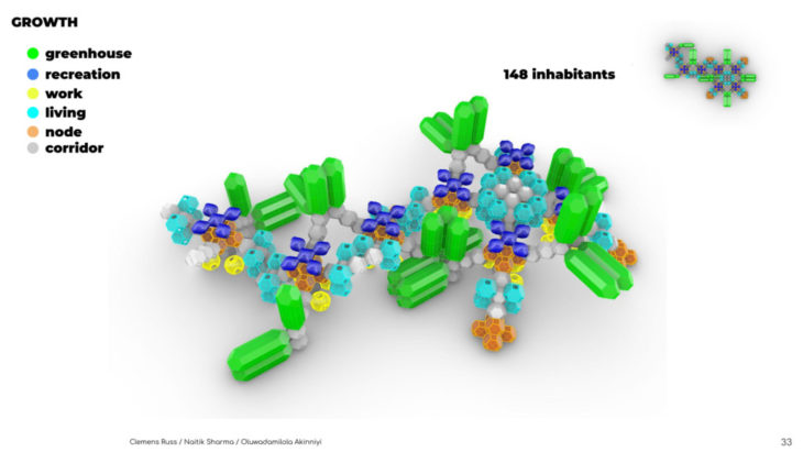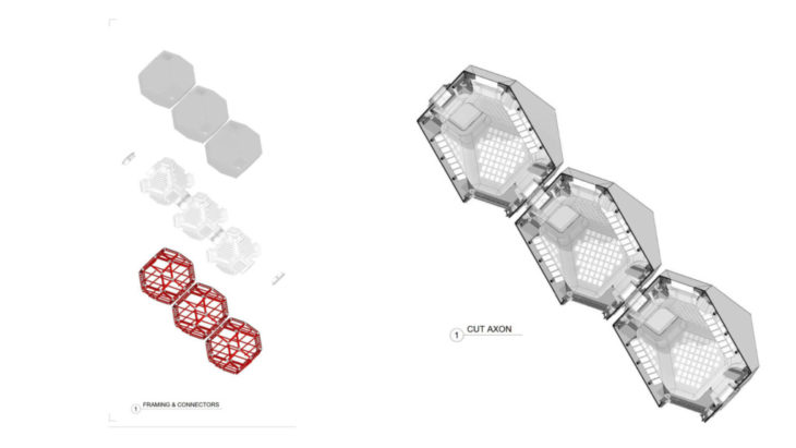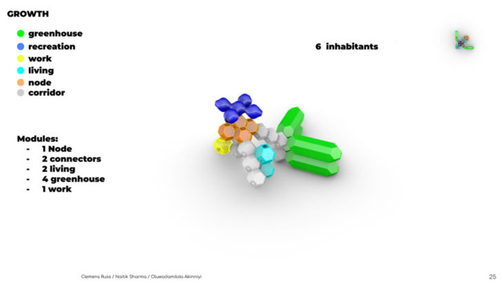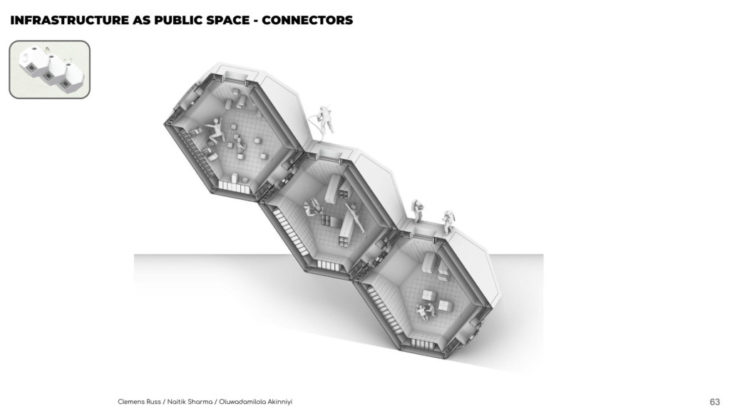 a 3 dimensional theoretical lattice was established as a framework. the infrastructure group focused mainly to connect the hexagonal faces of the platonic solid, which will enable infinite and multidirectional growth within the system on the one side. on the other side rectangular connectors are provided for the other groups (such as living, greenhouse, recreation, work) to satisfy their spacial requirements and empower design individuality within the system.