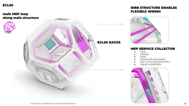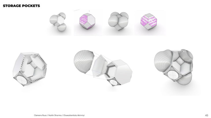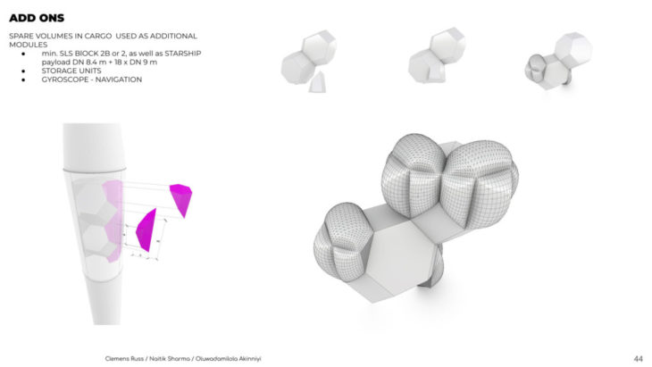 the single modules were designed to fit into a SLS rocket + starship , that can house payloads of 9,1 m usable diameter. the geometry of the truncated octahedron doesn’t use the full potential of 9,1 m diameter payload effieciently. therefore ADD ON parts were implemented,in order to provide additional value to spacestation, this units should house the gyroscope – navigation units + additional inflatable storage volume.
