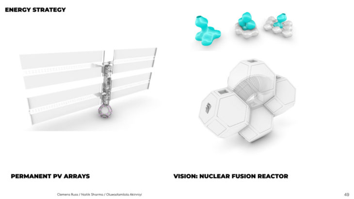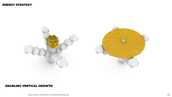 the energy strategy of the system is mainly based on PV arrays and as a vision nuclear fusion. the circular inflatable arrays enable the system to grow further vertical direction. the rectangular arrays will be placed at the end of the greenhouse modules,