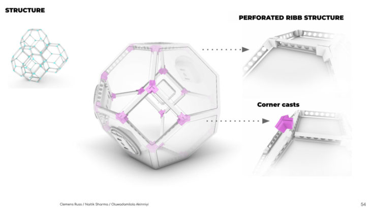 the modules are designed with a perforated ribbstructure, that gives flexiblity to the MEP wirings and pipes. the regular hexagonal and rectangular faces enable a modular approach to the windows, doors + hatches.