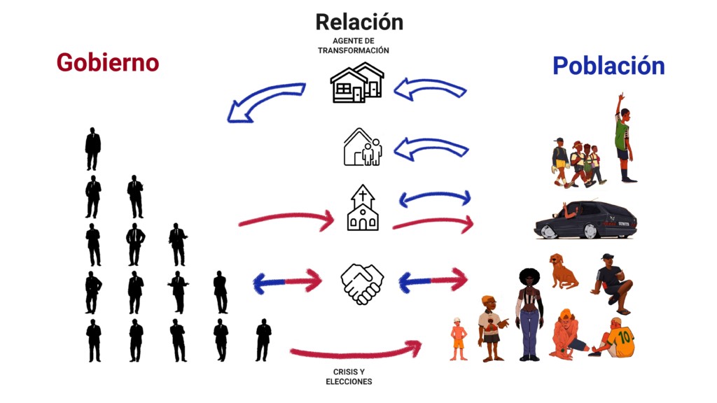 Este diagrama muestra parte de la relación entre población y gobernanza. Cito algunos agentes, como las asociaciones de vecinos y las instituciones religiosas.