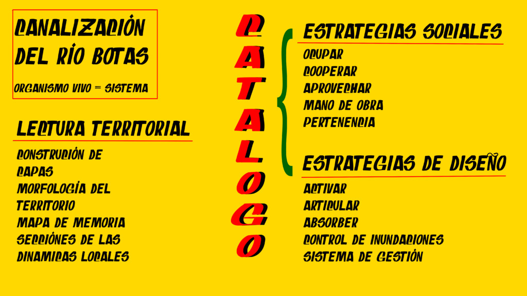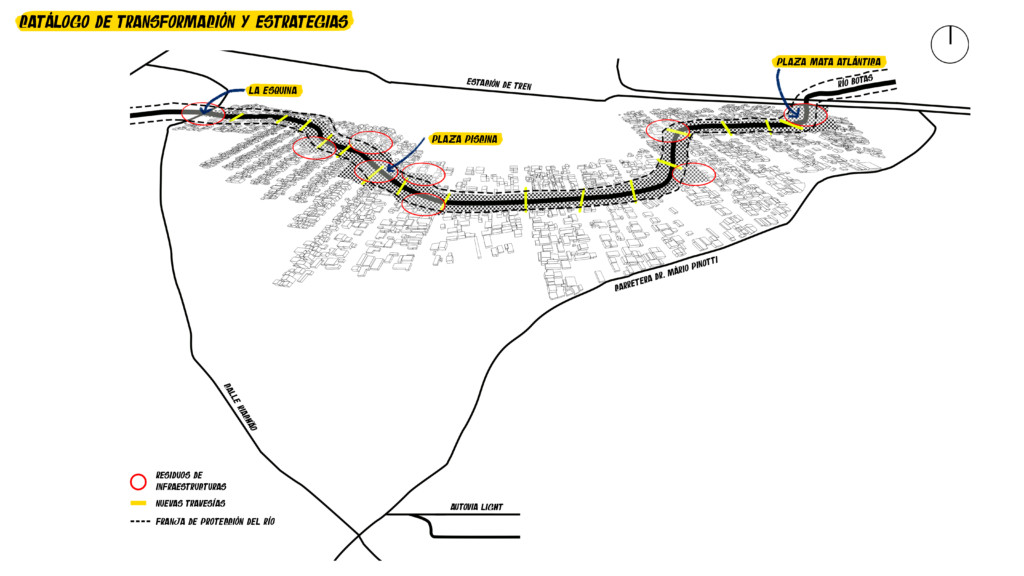 El “examen” de este territorio permitió descubrir los residuos urbanos que empiezan a aparecer a partir de las obras de canalización del río Botas, y donde parte de las estrategias, que es la implementación de la infraestructura verde y azul. Las tácticas proyectuales son dos caminos distintos que pueden encontrarse o no en algún momento de la aplicación y el tiempo.